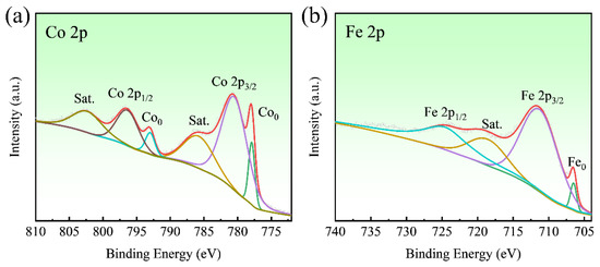 XPS was used to measure the electronic state of the elements of Fe and Co atoms in samples with different Co contents. Figure 3 shows the XPS narrow scan spectra of Fe 2p and Co 2p of the Fe35Co65 sample. The Co 2p spectrum (Figure 3a) clearly shows two spin-orbit double peaks at 780.2 eV and 796.2 eV, corresponding to Co2+ 2p3/2 and Co2+ 2p1/2, respectively, as oxidation peaks. The two oscillating satellites are at 786.2 eV and 802.3 eV (denoted as “Sat”). In addition, the zero-valent Co peaks are concentrated at 777.8 eV and 793 eV, indicating the presence of cobalt derived from FeCo alloys [36]. Similarly, the Fe 2p spectrum (Figure 3b) shows two spin-orbit double peaks for Fe2+ 2p3/2 (711.8 eV) and Fe2+ 2p1/2 (724.6 eV) and an oscillating peak (719.3 eV). In addition, the peak at 707.1 eV corresponds to zero-valent iron [37,38], which originates from the FeCo alloy.