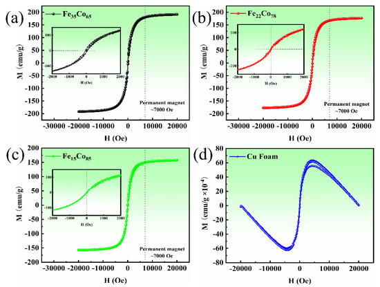 Figure 4a–c shows that the FeCo samples exhibited a typical hysteresis loop at room temperature, indicating that the samples had ferromagnetic characteristics at room temperature, and their saturation magnetization was above 180 emu g−1. The hysteresis loop in Figure 4d shows the anti-magnetic properties of the copper foam substrate. Additionally, it was shown that the catalysts were nearly saturated and magnetized under the action of a permanent magnetic field (~700 mT), which suggests that the impact of a permanent magnetic field on the magnetic catalyst was effective.