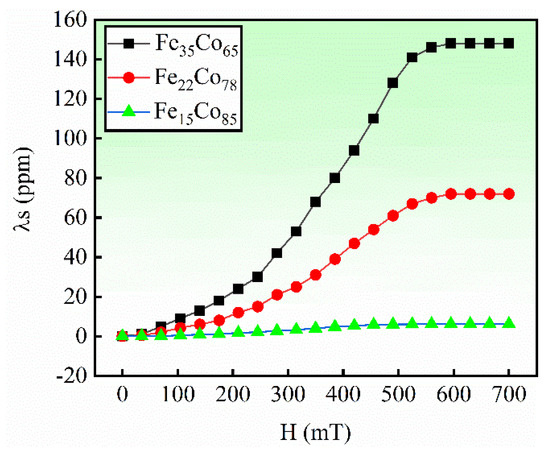 The magnetostriction of products with different initial Co contents was studied at room temperature using a VSM with a maximum magnetic field of 900 mT at room temperature. The magnetostriction coefficient test method is as follows: bond the strain resistance sheet to the material to be tested. Under the action of the magnetic field, the size of the magnet will change, and the stress will be applied to the strain resistance, thereby changing the resistance value of the strain resistance. The proportional relationship is transformed into the strain value of the specimen and displayed, which is the magnetostriction coefficient λ. The magnitude of magnetostriction is described by the magnetostriction coefficient λs (λs = λ∥ − λ⊥), as shown in Figure 5. In the Fe100−xCox alloy system, the magnetostriction first gradually becomes larger with the increase in Co content, and the maximum magnetostriction occurs at the interface (x~65) where the bcc phase and the (bcc + fcc) phase intersect. The reason is that the precipitation of nano-precipitates in the bcc matrix will cause the tetragonal distortion of the bcc matrix, thereby increasing the large magnetostriction. However, with the continuous increase in Co content and the growth of nano-precipitated phases, large-sized fcc-Co phases gradually appear, which leads to a sharp decrease in magnetostriction [28,29].
