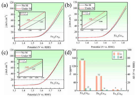 In order to visualize the influence of the magnetic field on the OER performance, LSVs were carried out in a KOH electrolyte as shown in Figure 6a–c. It can be clearly seen that the OER performance of all three catalysts is enhanced under the action of the magnetic field. Interestingly, under the same magnetic field strength, the change in the sample Fe35Co65 is the most obvious, where the LSV curve is shifted to the left more and the overpotential decreases the most. For Fe22Co78, the LSV curve also shows a more pronounced leftward shift, which indicates that its OER properties also improve to some extent under the magnetic field, while the change is smaller compared to Fe35Co65. For Fe15Co85, on the other hand, the LSV curve shows only a small deviation in the presence or absence of a magnetic field. Intriguingly, all three samples appeared to perform better than before under the action of a magnetic field. The amount of variation in the OER performance of these catalysts under a magnetic field shows a clear agreement with the strain generated under the magnetic field. Therefore, a preliminary conclusion can be drawn that the applied magnetic field changes the OER performance of the catalyst by affecting the strain of the material. In addition, the variation in the OER properties of blank copper foam in the presence or absence of a magnetic field was also tested. Copper is the anti-magnetic substance from Figure 4 that exhibits weak magnetic properties, so the response to the magnetic field is relatively small. As shown in Figure S2, the LSV curve does not change significantly, but showed a slight deviation similar to Fe15Co85, which could be the influence of the magnetic field on the mass transfer of the solution [24,39,40]. Figure 6d shows the corresponding relationship between the magnitude of magnetostriction and the change in overpotential. It can be clearly seen that the greater the strain caused by the magnetic field, the more the overpotential decreases, which means the more obvious the effect of the magnetic field on the catalyst. Meanwhile, Figure S3 shows the impedance change with and without the presence of a magnetic field. From the figure, we can see that, under the action of a magnetic field, the catalysts all exhibit smaller impedance, which is consistent with the corresponding electrocatalytic OER activity.