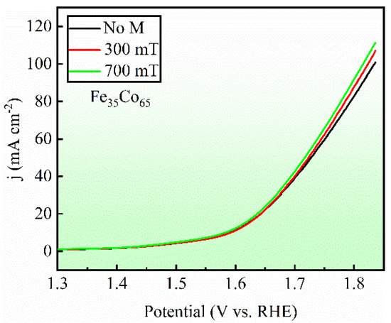 To further verify the effect of magnetic-field-induced strain on the OER performance, the OER performance of sample Fe35Co65 was tested at different magnetic field strengths. The LSV curves measured under the gradient of a magnetic field strength of 0, 300 and 700 mT are shown in Figure 7 and Table S1. An interesting phenomenon can be seen: as the magnetic field strength increases, the LSV curve without the magnetic field (black line) starts to gradually shift to the left; when the magnetic field strength reached 300 mT (red line), a significant shift started to appear, and as the magnetic field strength increased to 700 mT (green line), the curve continued to shift toward a lower voltage and the current density became larger. It can be concluded that there is a correlation between the magnitude of the magnetic field strength and the degree of improvement in the OER performance. In fact, the magnetostriction of the FeCo catalyst has reached saturation at approximately 500 mT, and the overpotential change in the sample at this magnetic field strength has also reached the maximum. A further increase in the magnetic field will not further improve the performance of the catalyst (Figure S5), but the maximum magnetic field of 700 mT was finally chosen to maintain the consistency of the experiment. Table S2 summarizes examples of magnetic fields affecting electrochemical catalytic reactions in recent years [21,24,25,27,43,44,45,46,47,48].