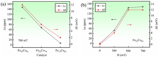 (a) Variation diagram of strain and overpotential of Fe100−xCox alloys under a magnetic field of 700 mT; (b) variation diagram of strain and overpotential of Fe35Co65 alloy under different magnetic field intensities.