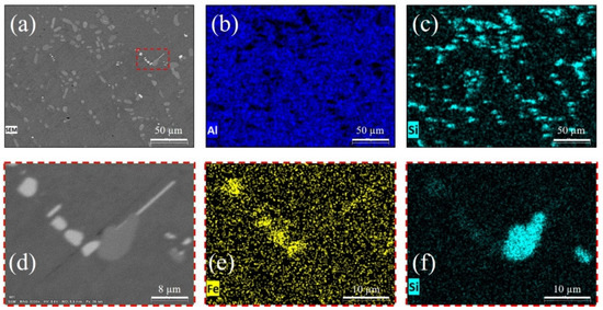 Figure 1 and Table 2 also show that the solution treatment changed the eutectic Si area and aspect ratio. The increase in eutectic Si area (4.7 ± 2.9 to 13.9 ± 4.6) implies Si agglomeration due to Si self-diffusion and Si–Al interdiffusion [21]. The decrease in the aspect ratio (3.0 ± 1.6 to 1.7 ± 0.7) of the eutectic Si proves that the solution treatment thermally activated the Si and promoted spheroidization [22,23]. Both Si agglomeration and spheroidization are evidence of the successful solution treatment (Figure 1d), highlighted in the SEM micrograph and EDS mapping in Figure 2. Given that α-Al and eutectic Si are not significantly changed during artificial aging [2], peak-aged (i.e., T6) samples were not characterized by optical microscopy. Figure 2d–f also show that Fe-rich intermetallic compounds were also observed in the forms of thin-needles β-phases (β-AlFeSi) and polyhedral α-AlSiMgFe, as is usual in Al–Si–Mg alloys with ultrasonically treated melts.