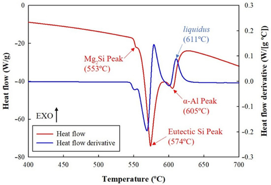 The dissolution of Mg2Si and the diffusion of its Mg and Si atoms into the α-Al matrix are fundamental aspects of allowing precipitation hardening after the solution (T4) heat treatment. Figure 3 shows that the cast samples precipitated Mg2Si in the grain boundaries, which may be diffused into the α-Al matrix. Figure 3 further proves the presence of Mg2Si by the peak highlighted (Mg2Si peak, 553 °C), while the eutectic Si and α-Al peaks were observed at 574 °C and 605 °C, respectively. The liquidus temperature for the A356 alloy with ultrasonically treated melt was observed to occur at 611 °C. The reported temperatures are well within the range of accepted temperatures for this alloy [24].