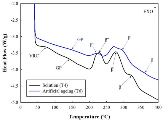 DSC analysis (heating) of solution-treated (T4) and artificially aged (T6) samples detailing the dissolution of the precipitates.
