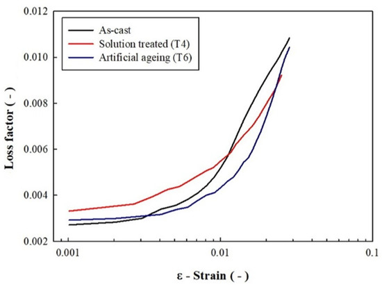 Dynamic loading is frequently characterized as forced vibration, meaning that the imposed strain is considered a variable [14]. Considering that Granato and Lücke [15] have long shown that forced vibration response is significantly dependent on strain amplitude, it is important to analyze the damping capacity of light alloys in this regime. This study reports the changes in the damping of A356 alloys as the strain is increased and considers different heat treatment stages. Experimental results show that the enhanced damping capacity may be achieved by selecting a solution treatment or artificial aging in the design phase, depending on the expected stress–strain states.