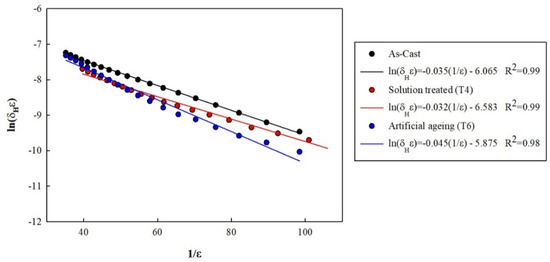 Granato–Lücke plots for as-cast, solution-treated (T4) and artificially aged (T6) samples.