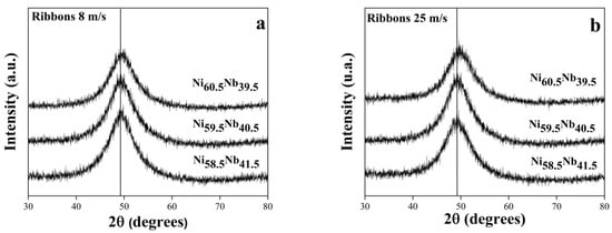 - Nowosielski, R.; Januszka, A.; Pilarczyk, W. Glass forming ability of binary Ni60+xNb40−x (x = 0; 1; 2) alloys. J. Achiev. Mater. Manuf. Eng. 2010, 42, 73–80. [Google Scholar]