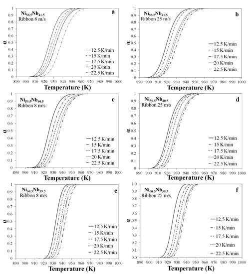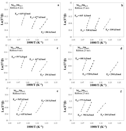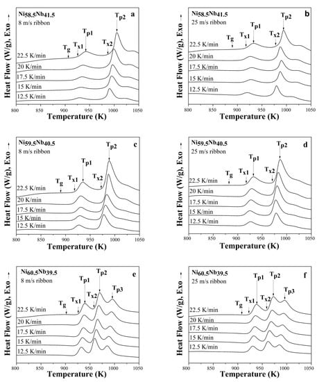 - Han, X.; Ding, F.; Qin, Y.; Wu, D.; Xing, H.; Shi, Y.; Song, K.; Cao, C. Compositional dependence of crystallization kinetics in Zr-Ni-Al metallic glasses. Vacuum 2018, 151, 30–38. [Google Scholar] [CrossRef]