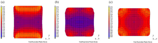 Moreover, when analyzing in detail by comparing Figure 6 and Table 1, it can be inferred that the degrees of stain increment by the same reduction are different for passes. For example, reductions of around 22% are applied to the sixth, seventh, and eighth passes in case no.2, while the plastic strain increments at the center are 0.3, 0.4, and 0.53, respectively. The same tendency can be found in the 9th and 11th passes in case no.1. The imposed strain at the center region is supposed to be caused by two factors, namely the applied reduction and the temperature distribution. The temperature in the central regions increases along with the rough rolling process, as illustrated in the above section. The deformation resistance of GCr15 steel decreases with the increasing temperature. Therefore, the increasing temperature in the center regions during rough rolling causes higher plastic deformation at later passes than in previous passes even though the same reduction design is applied. The coupling effects of temperature and deformation are complex. The temperature increment results from the deformation, and it enhances the deformation further. Using the developed FE model, this coupling effect of temperature and strain can be captured.