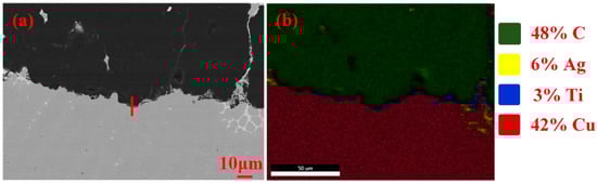 - Xiong, J.H.; Huang, J.H.; Zhang, H.; Zhao, X.K. Brazing of Carbon Fiber Reinforced SiC Composite and TC4 Using Ag-Cu-Ti Active Brazing Alloy. Mater. Sci. Eng. A 2010, 527, 1096–1101. [Google Scholar] [CrossRef]