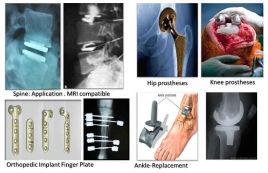 Currently, metallic materials such as titanium, stainless steel, magnesium, etc. are widely used in the fields of orthopedics and dentistry because of the superior mechanical properties (e.g., high tensile strength, toughness, and fracture resistance) compared with the ceramics and bio-glass [,]. Some typical applications of the metallic materials are shown in Figure 1.