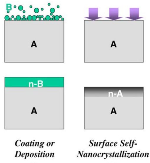Schematic illustrations of (A) surface coating and (B) surface nano-crystallization reprinted with permission from Ref. []. Copyright 2022, ELSEVIER.