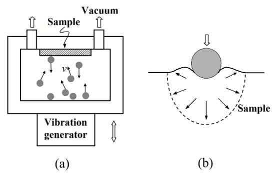 Surface mechanical attrition treatment (SMAT) is a physical modification method for obtaining new gradient nanometal materials []. It is an effective method for achieving the surface nanocrystallization of many metals, such as titanium, aluminum, nickel, steel, magnesium, and copper. The basic process is summarized as follows: Smooth spheres made of steel or ceramic, with a diameter of 3–10 mm, are placed in a chamber which is connected to a vibration generator. The vibration frequency of the chamber is 50 Hz and 20,000 Hz for I-type and II-type SMAT techniques, respectively []. The sample surface to be treated is impacted by a large number of balls in a short period of time, with a velocity of 1–20 m/s depending on the vibration frequency and the distance between the sample surface and the balls []. The impact of each ball causes severe plastic deformation (SPD) on the surface layer and facilitates the process of nanocrystallization. The thickness of the nanostructured surface layer depends very much on the processing parameters (such as ball size, vibration frequency, temperature, etc.) []. With flexibility and low cost, SMAT can obtain localized nanostructured surface layers in bulk materials and is capable of treating the surfaces of parts with complex shapes. In addition, this technique can produce surfaces with low roughness because of the better quality of shots and a lower impact speed []. The SMAT process is illustrated in Figure 3.