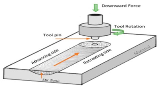 FSP provides great flexibility in terms of processing conditions to tailor the localized microstructure in a material []. Its principle is similar to friction stir welding, which uses frictional heat to treat materials. The tool shoulder is fastened to the sample, and the tool pin is in close contact with the surface of material. As shown in the Figure 6, in the process of FSP, the tool pin rotates at high speed and moves to the specified direction; then, severe plastic deformation occurs on the surface of sample, which is called the stir zone. Due to high frictional heat and dynamic recrystallization [], fine grains will be generated in the processing area. The main parameters influencing FSP are rotating speed, advancing speed, plunging force, etc. In addition, microstructure and mechanical properties will also be altered with respect to the geometry of tool and the materials it uses []. The strict requirements of the processing conditions are a major disadvantage of FSP, hindering extensive use of this technique. In addition, the relatively high temperature during the process makes it difficult to adapt it to the production of grain structures in the nanoscale regime [].