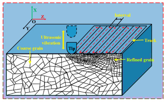 The ultrasonic shot peening (USSP) process is a kind of shot peening. It can optimize the characteristics of the material surface, modify the material properties, and improve the wear and fatigue resistance. A power ultrasonic horn causes impacts with high frequency (generally higher than 20 kHz) and low amplitude. The whole process is quiet because it operates more frequently than the human ear can perceive. The high-frequency and multi-directional shock acts on the surface randomly, creating a kind of microdimple shape and forming a nanocrystalline surface layer. USSP treatment is an effective approach for forming a nanostructure layer on the surface of metallic materials []. However, the relatively high strain might result in residual porosities, impurities, and dimensional issues []. The main structure of USSP is displayed in Figure 4.