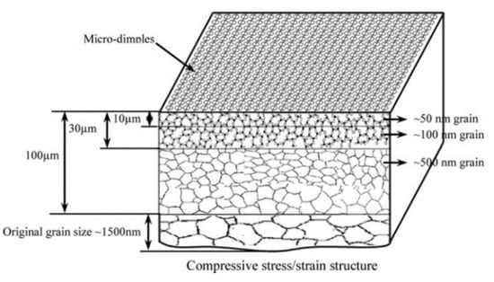 Schematic illustration of structure characteristics and distributions in a surface layer subjected to the UNSM reprinted with permission from Ref. []. Copyright 2022, ELSEVIER.