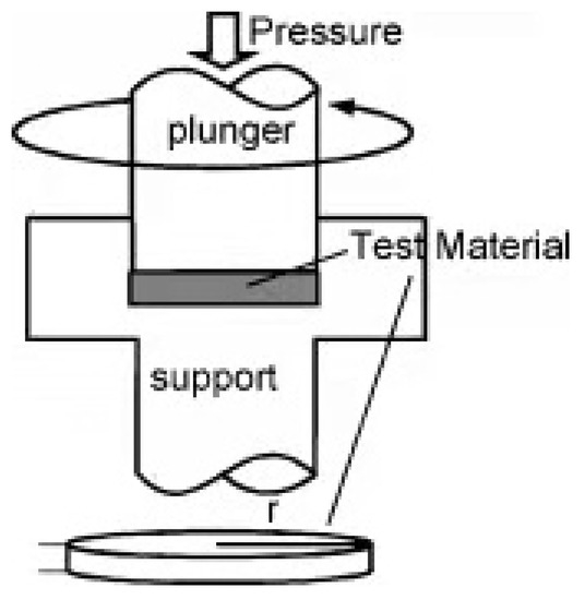 High-pressure torsion (HPT) refers to the processing of a metal which bears compressive force and simultaneous torsion force. As shown in Figure 9, the sample in this process is laid in the shape of a disc between two anvils. The sample is subjected to a squeezing pressure P of several GPa at room temperature; at the same time, it bears a torsion force generated by the rotation of the lower anvil [,]. Sometimes, in order to improve the HPT processing efficiency, the process needs to be carried out at a higher temperature; under this condition, the shearing and pressing speed should be controlled []. During HPT, the strain is allowed to continuously change, and it is easy to achieve high shear strains. Moreover, even materials that are relatively hard and brittle can undergo the severe deformation in this method [].