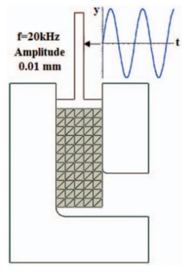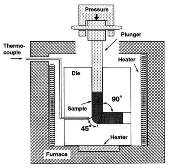 Based on ECAP, several variants have been developed to enhance its effect. A novel method proposed the application of vibrations with ultrasonic frequencies on the plunger to reduce the friction and forming load during ECAP; longitudinal ultrasonic vibrations were imposed onto the billet [], as shown in Figure 12.