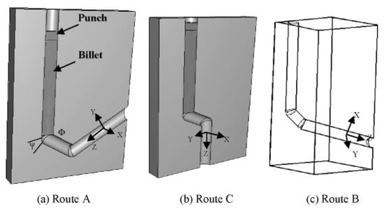 - Suo, T.; Li, Y.; Deng, Q.; Liu, Y. Optimal pressing route for continued equal channel angular pressing by finite element analysis. Mater. Sci. Eng. A 2007, 466, 166–171. [Google Scholar] [CrossRef]