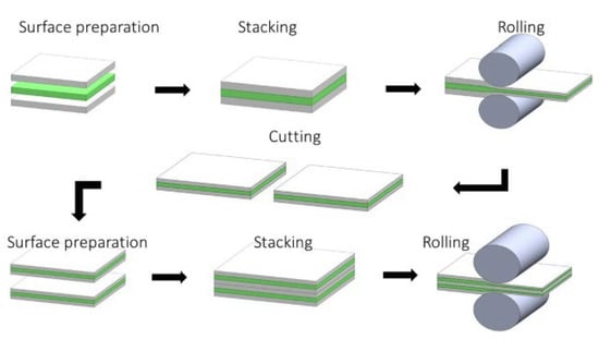 Accumulative roll bonding (ARB) was first proposed in 1999 by Y. Sato et al. []. Compared with other bulk grain refinement methods, such as ECAP and HPT, which require large load capacities and many dies, its unique advantage is that it can be mass-produced at a lower operating cost, which makes it applicable to industrial manufacture. Its basic process is shown in Figure 14; in this process, the stacking of materials and traditional seam welding are repeated. Firstly, place one strip aligned on top of the other, clean the mating surfaces to remove layers of sediment, and then apply a wire brush to enhance the bonding strength between the materials []. The two layers are joined together by rolling, just as in a traditional rolling bonding process; then, the rolled material is cut in half. The cut strip is once again surface treated, stacked, and seam welded, and the whole process is repeated. The whole process should be conducted at an elevated temperature, but below recrystallization temperature because recrystallization will cancel out the accumulated strain. Low temperature would result in insufficient ductility and bond strength [].