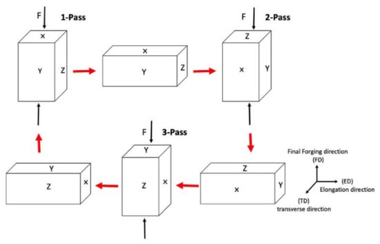 Multi-directional forging is a plastic deformation process that was proposed in the mid-1990s for the preparation of bulk ultrafine-grained metal materials. Its working principle is that the direction of the applied force is continuously changing during operation, and the multiple forgings in different directions of the billet are equivalent (as shown in Figure 17 and Figure 18). Since its operating temperature is usually in the recrystallization temperature range of the alloy and the load is relatively low, the MDF process can be used to prepare nanostructured/ultrafine-grained materials. During the MDF process, the change of the loading direction has a great influence on the rheological behavior and microstructure evolution of the material. With the applied pressure on the material in three vertical directions changing continuously, the relationship between flow stress and strain as well as the evolution process of the microstructure of the materials can be systematically studied []. The advantage of this method is that nanostructures can be obtained in rather brittle materials, since the process starts at high temperatures and the specific loads applied to the product are relatively low.