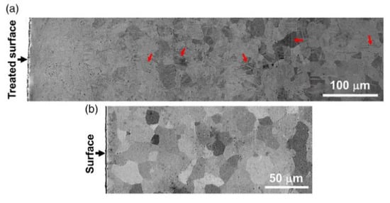 Laser shock peening (LSP) is a surface modification process that uses laser beams to generate shock waves on the surface of a material. As shown in the Figure 5, a high-energy laser is emitted from the light source, reflected by the mirror, and irradiated on the surface of the sample after being focused. The continued delivery of laser pulses rapidly heats and ionizes the vaporized material, converting it into rapidly expanding plasma [] while a shock wave is created. If the amplitude of the shock wave is above the Hugoniot elastic limit (HEL) of the target, the material deforms plastically during the passage of shock waves, resulting in compressive residual stresses below the target surface []. However, due to the thermal effect, LSP is less efficient in refining the surface grains compared to the mechanical treatments. The LSP process is expensive and takes a long time to scan a large area compared with other processes [].