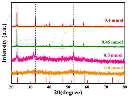 Figure 1 shows the XRD (X-ray Diffractometer) patterns of Co3Sn2Sx (x = 0.4 mM, 0.46 mM, 0.5 mM, 0.6 mM) obtained by equal amounts of 0.11 mM Co3Sn2(OH)6, respectively. From the figure, it can be found that, when the molar ratio of element S is 0.4 mmol, the characteristic diffraction peaks of Co3Sn2S2 were detected in XRD patterns at 19.89°, 22.97°, 32.68°, 36.63°, 38.65°, 40.24°, 46.87°, 52.84°, 58.26°, and 73.19°. This indicates that the content of the molar ratio of S elements reached the conditions for the preparation of Co3Sn2S2, at the high temperature and pressure environment; the replacement reaction with OH− was sufficiently performed under the alkaline environment to generate Co3Sn2S2 with a shandite type structure. When we continue to increase the molar ratio of S elements beyond 0.4 mM, the characteristic diffraction peaks of Co3Sn2S2 gradually become weaker, which indicates that Co3Sn2S2 is successfully achieved with enough S elements, and when we continue to increase the molar amount of S elements to 0.6 mM, causing the diffraction peak signal to gradually disappear. Therefore, the molar atomic ratio of S elements has an important effect on the crystal structure of Co3Sn2S2 under the same reaction temperature. As shown by the results of XRD energy spectrum, when the molar atomic ratio of S elements is 0.4 mM, Co3Sn2S2 with Shandite structure was achieved.