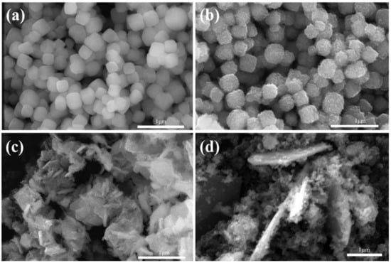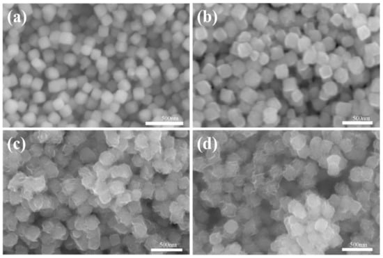 After that, we combined SEM (Scanning Electron Microscope) images to analyze the morphology of Co3Sn2Sx (x = 0.4 mM, 0.46 mM, 0.5 mM, 0.6 mM) samples formed by different molar ratios of S elements. Under the same reaction temperature preparation conditions, Figure 2a–d show the morphological images of Co3Sn2Sx samples prepared using equal amounts of 0.11 mM precursors with different molar ratios of S elements. From Figure 2, it can be found that, when the molar atomic ratio of S element is 0.4 mM, the precursor preparation of Co3Sn2Sx sample surface is smooth and close, with almost regular box morphology and the size being about 200 nm. With the increase of the molar ratio of S elements, the surface of the Co3Sn2Sx samples we obtained gradually becomes rough, and the box morphology gradually becomes irregular. Therefore, we found that the increase of the molar ratio content of S elements can change the surface of Co3Sn2Sx.