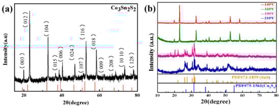 (a) XRD patterns of Co3Sn2S2; (b) XRD patterns of Co3Sn2S2 at different reaction temperatures.