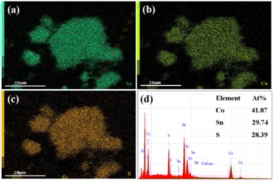 (a) Distribution of Co elements; (b) distribution of Sn element; (c) distribution map of S element; (d) EDS of Co3Sn2S2 nanocrystals.