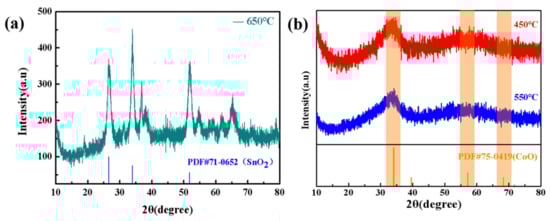 Furthermore, we try to anneal the sample to improve its crystallinity. Figure 6 shows the XRD patterns of the Co3Sn2S2 nanocrystals at different annealing temperatures. Compared to before annealing, the XRD diffraction peaks change greatly after annealing, and, with the increase of annealing temperature, the diffraction peak was changed. Figure 6a shows the XRD patterns of Co3Sn2S2 after annealing at 450 °C and 550 °C. It can be seen that the diffractograms show CoO (JCPDS No.75-0419) characteristic diffraction peak positions at 27.32° and 58.46°. With the gradual increase of annealing temperature, when the annealing temperature is 650 °C, multiple diffraction peaks appear in the diffractogram, which are located at various positions such as 25.85°, 34.52°, 38.76°, 52.41°, and 65.91°, as shown in Figure 6b. This is consistent with the position of the characteristic diffraction peak of SnO2 as shown by Jade analysis (JCPDS No. 71-0652). Comparing the XRD patterns of Co3Sn2S2 obtained after different annealing temperatures with before annealing, we found that the annealing temperature did not improve the crystallinity of Co3Sn2S2, and, with the annealing temperature increasing, the original Shandite structure was gradually destroyed and new oxides were formed, such as CoO and SnO2. This may be due to the instability of the S element in Co3Sn2S2, and the increase in annealing temperature causes the S element to volatilize and overflow, resulting in the remaining Co element and Sn element combining with oxygen to form oxides. Furthermore, in combination with the EDS elemental ratio analysis, we verified the oxygen content variation.