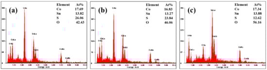 (a) EDS of Co3Sn2S2 nanocrystals annealed at 450 °C; (b) EDS of Co3Sn2S2 nanocrystals annealed at 550 °C; (c) EDS of Co3Sn2S2 nanocrystals annealed at 650 °C.