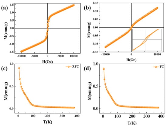 Next, the magnetic properties of Co3Sn2S2 annealed at 450 °C for 2 h and the unannealed Co3Sn2S2 prepared at 150 °C were tested and analyzed by the PPMS (Physical Property Measurement System) system; the heat treatment and annealing environment is in an anaerobic environment filled with Ar. The curve of its magnetic field strength versus magnetization strength is obtained, as shown in Figure 8. As can be seen from Figure 8, Co3Sn2S2 is a ferromagnetic substance with obvious ferromagnetic properties. The magnetic properties of the unannealed Co3Sn2S2 were weak, and the magnetization did not reach saturation. According to the results of comparing Figure 8a with Figure 8b, the coercivity and the residual magnetization intensity of the Co3Sn2S2 annealed at 450 °C are larger than the corresponding values of the unannealed Co3Sn2S2, and the magnetization intensity becomes larger in the same magnetic field. Combined with the XRD structural analysis, it is clear that annealing can change the Co3Sn2S2 crystal structure and affect its ferromagnetism. The ZFC/FC magnetic measurements of the Co3Sn2S2 nanocrystals revealed a weak Curie temperature transition point around 100 k, which indicates that we successfully synthesized Co3Sn2S2 nanocrystals with ferromagnetic properties using the hydrothermal method.