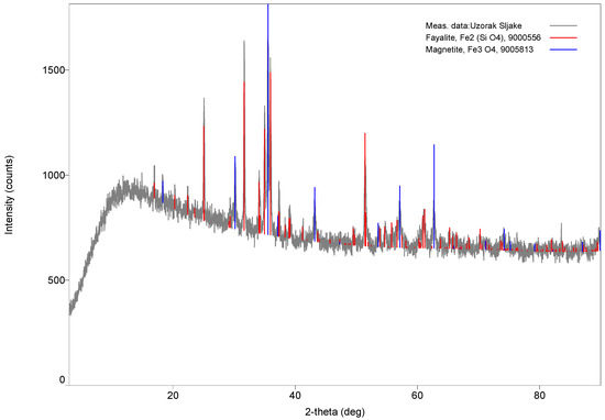 From the XRD pattern shown in Figure 1, it can be seen that fayalite and magnetite are the main minerals present in the slag, which is in accordance with previous research conducted on various types of slag [16,17].