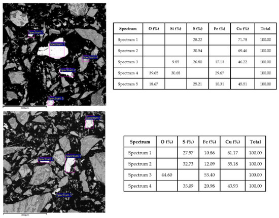 In order to determine copper content, Atomic Absorption Spectrophotometer–Perkin Elmer 2380 (Leko, Prague, Czech Republic) was used, by dissolving 0.1 g of the sample with the mixture of acids: HCl, HNO3, and HF. The same instrument was also used for determination of oxide copper content and the only difference was that the sample was dissolved with diluted H2SO4. The instrument Carbon and Sulfur Analyzer–HORIBA EMIA 920 (HORIBA, Ltd., Kyoto, Japan) was used for sulfur content, by adding tungsten, potassium, and iron to 0.01 g of the sample, in order to accelerate its burning. Inductively Coupled Plasma Optical Emission (ICP-OES) Spectrometer–Spectro Ciros Vision (Spectro., Cleve, Germany) was used for determination of contents of Al2O3, SiO2, and Fe. In order to determine Si content, 0.5 g of sample was mixed with the mixture of sodium and potassium carbonates and melted, while contents of Al and Fe were determined from the remaining filtrate.