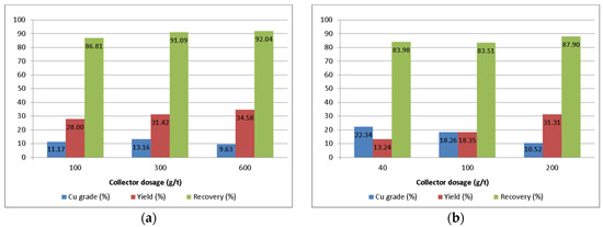 Analyzing the results of flotation tests presented in Figure 3a, it can be concluded that SIPX provided high copper recovery, especially with higher dosages 300 g/t and 600 g/t. Yield was also high with these two dosages, while copper grade in concentrate with dosage 600 g/t was significantly lower, 9.63%; then, it was with 300 g/t, 13.16%. Bearing this in mind, it can be said that SIPX collected both liberated particles of copper and middlings. Therefore, dosage 300 g/t was selected for further experiments because the results it gave were as good as or even better than the double dosage.