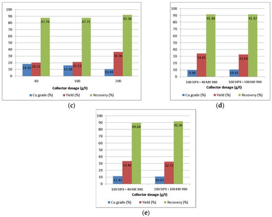 The influence of collector type and dosages on smelter slag flotation indicators (Cu grade, yield and recovery): (a) SIPX; (b) MX 980; (c) TC 1000; (d) mixture SIPX and MX 980; (e) mixture SIPX and TC 1000.