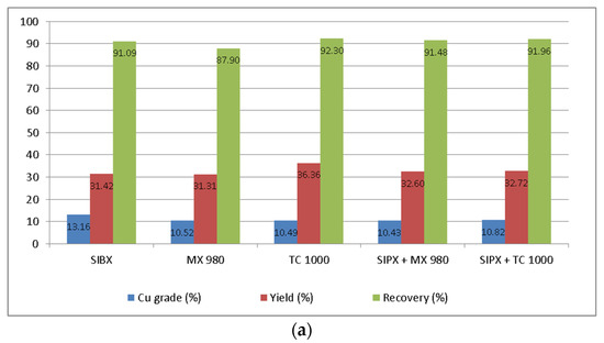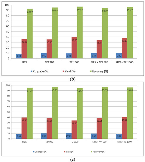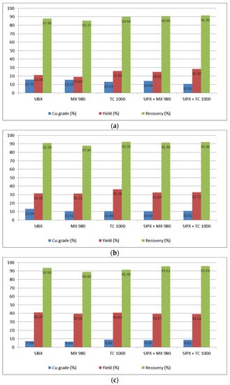 From Figure 5, it can be seen that the increase in pulps’ pH had a positive effect of copper recovery rates for all collectors and their mixtures. At pH 8 (Figure 5a), recovery rates ranged around 91–92%, except for MX 980, whose recovery rate was 87.90% again showing the same tendency as in previous experiments. However, the increase in pulps’ pH had a positive impact on recovery of copper even for collector MX 980. Increasing pulps’ pH from 8 to 10 (Figure 5b) led to increasing the recovery rates and yield for all collectors and mixtures, while the copper grades slightly decreased except for SIPX, whose decrease in a copper grade was the highest, around 4.5%. The further increase from pH 10 to pH 12 (Figure 5c) additionally increased recovery rates for all collectors and mixtures. The highest recovery rate was obtained with MX 980, 96.06%, but the other collectors and their mixtures also provided high recovery rates from 94.52% (TC 1000) to 96.02% (SIPX + MX 980).