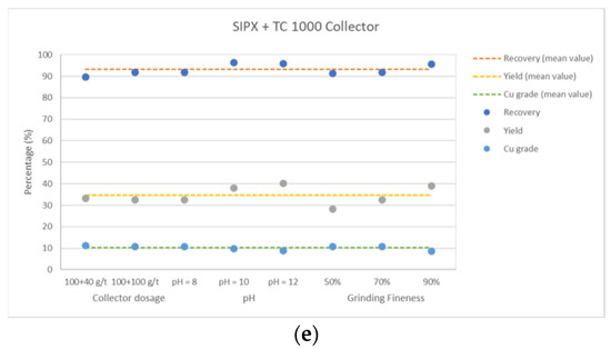 Statistical analysis of influence of collector dosage, pulps’ pH and grinding fineness on recovery, yield and copper grade for different collector types: (a) SIPX; (b) MX 980; (c) TC 1000; (d) mixture of SIPX and MX 980; (e) mixture of SIPX and TC 1000.