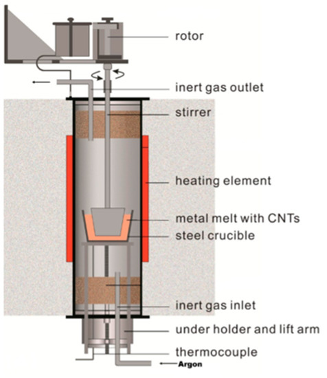 The Pt-coated MWCNT/Mg AZ91 composites were produced by a two-step process, including pre-dispersion and a melt stirring step as described in our previous work [25,35,54]. The block copolymer Disperbyk-2150 (BYK Chemie GmbH) was first dissolved in ethanol in a small beaker. Then Pt-coated MWCNTs (0.1 wt% of the metal matrix, mass ratio to the block copolymer 1:1, diameter of 5–20 nm, Baytubes R C 150P) were added to the as-prepared solution. This mixture was put at room-temperature into an ultrasonic bath for 15 min. Then it was stirred for 30 min at 250 rpm. After adding Mg alloy chips (AZ91 D, ECKA Granules Germany GmbH), the suspension was further stirred at 250 rpm inside a fume cupboard to evaporate the ethanol and homogenise the mixture. After the mixture was dried, the mixed chips were placed in a cylindrical sample crucible. This crucible was placed into an oven and heated up to 700 °C under an inert Argon gas atmosphere to avoid oxidation. When the Mg alloy chips were molten, the liquid was mechanically stirred at 350 rpm for 30 min to further disperse MWCNTs. After stirring, the molten MWCNT/Mg composite was poured into a mould. The cooled sample was machined to cylindrical shaped specimens (diameter 5 mm height 7 mm) for subsequent compression tests. Non-coated MWCNT/AZ91 composite and pure AZ91 alloy were produced by using the same process for comparison. The schematic drawing of the melt stirring furnace (Customised by Linn High Therm, Hirschbach, Germany) used in this study is shown in Figure 1.