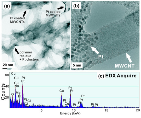 Transmission Electron Microscopy (TEM) images and the EDX analysis of Pt-coated MWCNT are shown in Figure 2. Figure 2a confirms a uniform Pt nanoparticle distribution (black dots) on the surface of the MWCNTs using our modified “layer-by-layer” coating approach. Polymer residue and Pt agglomerated clusters were still found on the surface of MWCNTs as pointed out by arrows. The higher magnification of the TEM image (Figure 2b) shows that the Pt have been coated as small clusters with diameters in range of 2.0 to 5.0 nm on the surface of the MWCNTs. EDX analysis confirmed Pt deposition on the surface of MWCNTs (Figure 2c).