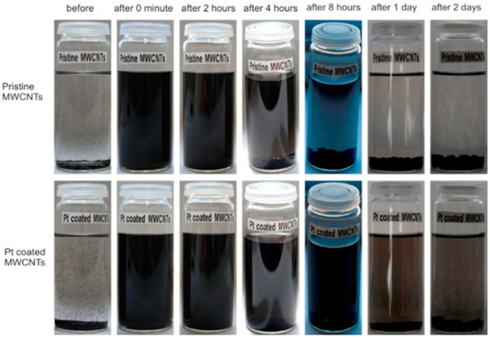The dispersibility and dispersion stability of Pt-coated MWCNTs were compared to pristine MWCNTs. By using the same amount of MWCNTs in the same amount of ethanol after the same treatment (ultrasonification for 15 min), the difference between Pt coated MWCNTs and pristine MWCNTs can be observed in Figure 3. Straight after ultrasonification, both solutions showed an evenly black colour (after 0 min) and after two hours, the difference was still not too obvious. However, after 4 h, the pristine MWCNTs started re-agglomerating and black MWCNT agglomerations could be observed on the bottom of the bottle; while for Pt-coated MWCNTs, the solutions were still all black and no obvious agglomerations could be observed, which can be attributed to the improved dispersion stability by coating Pt on the CNTs. After 8 h, more agglomerates of pristine MWCNTs could be found on the bottom of the bottle while the solution of Pt-coated MWCNTs stayed clearly black. After 1 day and 2 days, the solution of the pristine MWCNTs showed a much lighter colour compared to Pt coated MWCNTs and big agglomerations could be found on the bottom, while the solution of Pt coated MWCNTs still presented a rather even black colour with fewer agglomerations on the bottom. The behaviour could be explained as the Pt coating maybe acting as spacers to break van der Waals force among the MWCNTs and preventing them from re-agglomerating; therefore, the Pt coated MWCNTs have an improved dispersion ability and stability.