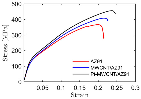 Typical stress-strain curves of pure AZ91, 0.05 wt% uncoated MWCNT/AZ91 composite, and 0.05 wt% Pt-MWCNT/AZ91 composite.