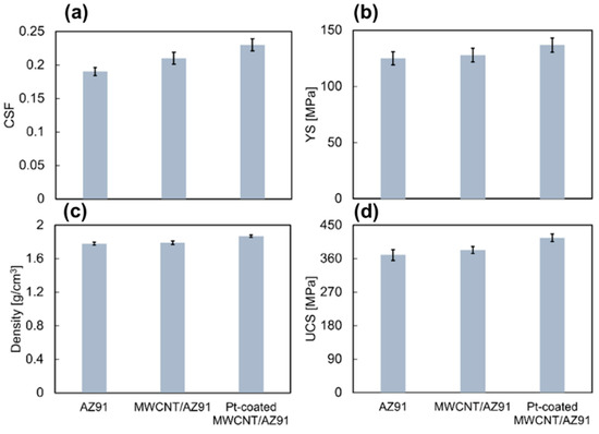 Comparison of (a) compression strain at failure (CSF), (b) yield strength (YS), (c) density, and (d) ultimate compressive strength (UCS) between pure AZ91, 0.05 wt% MWCNT/AZ91 composite, and 0.05 wt% Pt-coated MWCNT/AZ91 composite.