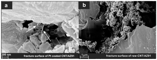 Fracture surface of (a) Pt coated CNT/AZ91 composite and (b) raw CNT/AZ91 composite after compression test. Arrow points at the individual CNT pulled out of the fracture surface after failure.
