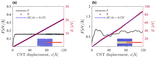 MD simulation of CNT pull-out from Mg matrix; (a) pristine CNT in Mg matrix, (b) Pt-coated in Mg matrix; inset pictures show the cross section of the configuration during the pull-out simulation. Blue, red, and yellow atoms at the insets represent Mg, C, and Pt atoms, respectively.