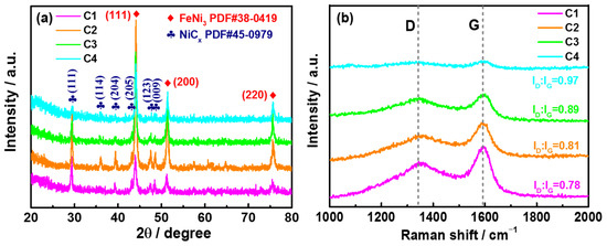 Figure 2a displays XRD curves of as-prepared C1-C4 composites. It obviously shows three peaks at 44.3°, 51.5° and 75.9°, assigned to the (111), (200) and (220) planes of FeNi3 (PDF#38-0419). The formation of the alloy phase in the composites is due to high temperature reduction of carbon [29]. While the remaining peaks at 29.4°, 36.2°, 39.9°, 43.2°, 47.7° and 48.6° are generated from (111), (114), (204), (205), (123) and (009) planes of NiCx (PDF#45-0979), owing to reaction between the excess nickel source and the carbon component. No evident peaks for graphitized carbon can be observed in the composites, which means the carbon component here may be in an amorphous state. Figure 2b displays the Raman spectrum of these composites, with typical peaks around 1580 cm−1 and 1340 cm−1 are in G and D bands, respectively. The D band is related to disordered carbon atoms e.g., defects, groups and grain boundaries etc., and the G band is generated from the vibration of carbon atoms in plane, indicating the graphitization of carbon atoms [30,31]. It shows that the D and G peaks wear off gradually from C1 to C4, owing to the increasing concentration of Fe and Ni sources in the precursor for the preparation of such composites, resulting in reduction of carbon content in the final products. However, the strength ratios of D to G peaks are 0.78, 0.81, 0.89 and 0.97, respectively; the increasing tendency indicates more disorders can be acted on as sites of dipole polarization to strengthen the dielectric loss of the C4 sample [32].