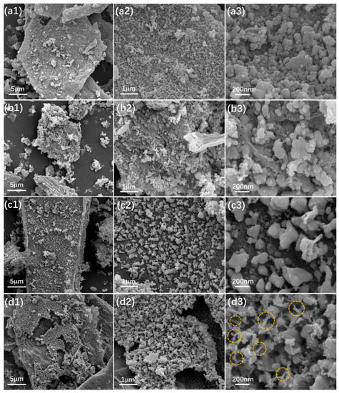 SEM images of C1 (a1–a3), C2 (b1–b3), C3 (c1–c3) and C4 (d1–d3).
