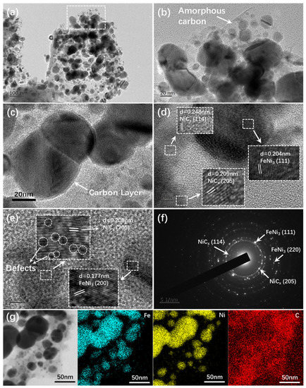 Here, the above C4 composite was selected as the typical case to be further observed via the TEM technique. In Figure 4a, the formed NPs are all adhered to the laminated skeleton, which is made up of amorphous carbon, as shown in Figure 4b. Moreover, Figure 4c also indicates that there is a thin carbon layer coated on the surface of these NPs, migrating from the carbon frame under the action of high temperature thermal diffusion [35]; this is an important factor to optimize impedance matching of NPs in the composite [36]. Figure 4d shows the crystal spacing of 0.204 nm in a large particle, corresponding to the (111) plane of FeNi3 phase, while the spacing of 0.248 nm and 0.209 nm in small particles are (114) and (205) planes of NiCx. Besides, apart from (205) plane of NiCx, Figure 4e displays the (200) plane of FeNi3 with crystal spacing of 0.177 nm as well. In addition, a large quantity of defects can be found in NiCx particles and are marked in the dotted circle, foreboding potential dipole polarization for microwave loss at these sites [37]. Figure 4f shows several diffraction rings in SAED of reciprocal space, indicating the polycrystalline property of these NPs. Furthermore, the representational points for (111) and (220) planes of FeNi3 together with (114) and (205) planes of NiCx can be simultaneously observed, which is in agreement with the results of XRD. The element mapping of Figure 4g reveals that the Ni and Fe elements are located at the region of nanoparticles; however, the C element is distributed within the whole frame.
